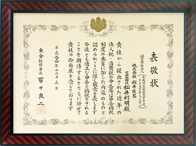 平成24年度に優良申告法人として表敬され、適正申告のための態勢が極めて良好と認められ、表彰状の授与を受けました。